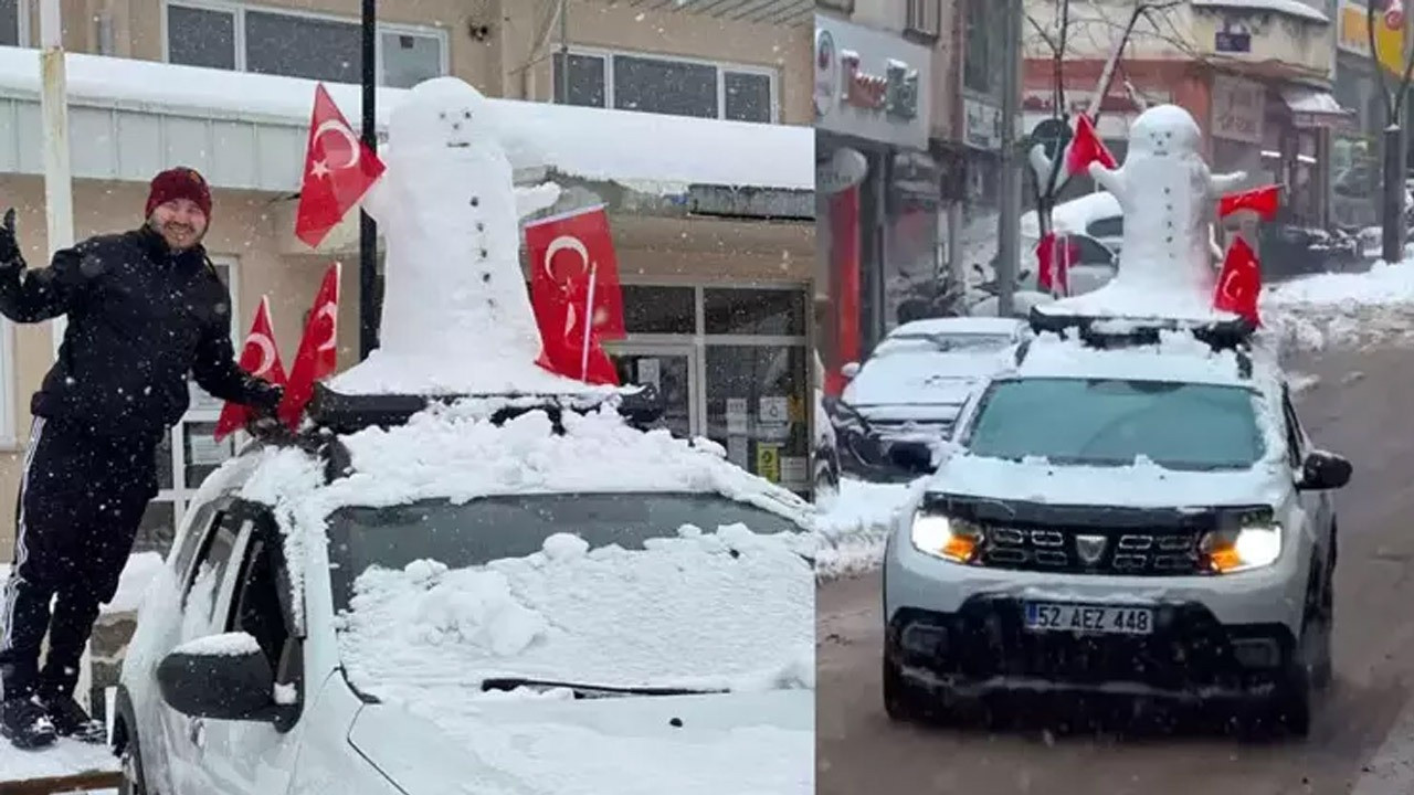 Ordu'da bir vatandaş, yaptığı kardan adamı aracının üzerine yerleştirdi. Bayraklarla donattığı kardan adamla şehir turu atan Okvur, "Çocukken hep böyle bir şey yapmak isterdim. Hayalimi gerçekleştirdim” dedi.