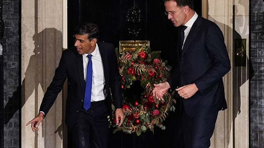 İngiltere Başbakanı Rishi Sunak, Rutte'yi kapıda karşıladıktan sonra iki lider samimi bir şekilde el sıkışarak kameralara poz verdi.