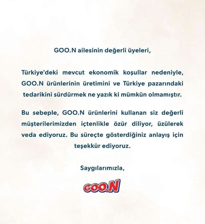 "Türkiye'deki mevcut ekonomik koşullar nedeniyle, GOO.N ürünlerinin üretimi ve Türkiye pazarındaki tedarikini sürdürmek ne yazık ki mümkün olmamıştır.