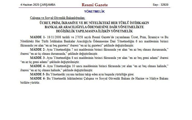 SGK Uzmanı Özgür Erdursun da, sosyal medya üzerinden yaptığı paylaşımda, 4 Haziran 2025 Çarşamba tarihli ve 32920 sayılı Resmi Gazete’de yayımlanan "Ücret, Prim, İkramiye ve Bu Nitelikteki Her Türlü İstihkakın Bankalar Aracılığıyla Ödenmesine Dair Yönetmelikte Değişiklik Yapılmasına İlişkin Yönetmelik" ile ilgili önemli uyarılarda bulundu.
