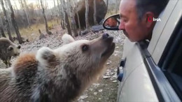 Aracına yaklaşan boz ayıyı ağzıyla besledi