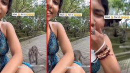 Kısa eteğiyle yere çömelen genç kadın, maymunun tacizine uğradı