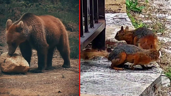Karabük'te doğal yaşamın zenginliği kamerada: Yiyecek arayan ayı ile sincaplar kameraya böyle yansıdı