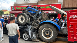Tokat'ta facianın eşiğinden dönüldü! Freni boşalan traktör aracın üstüne çıkarak durabildi