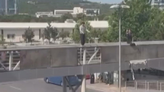 Kartal'da yürekleri ağza getiren anlar! Üst geçitten elektrik direğine böyle atladı