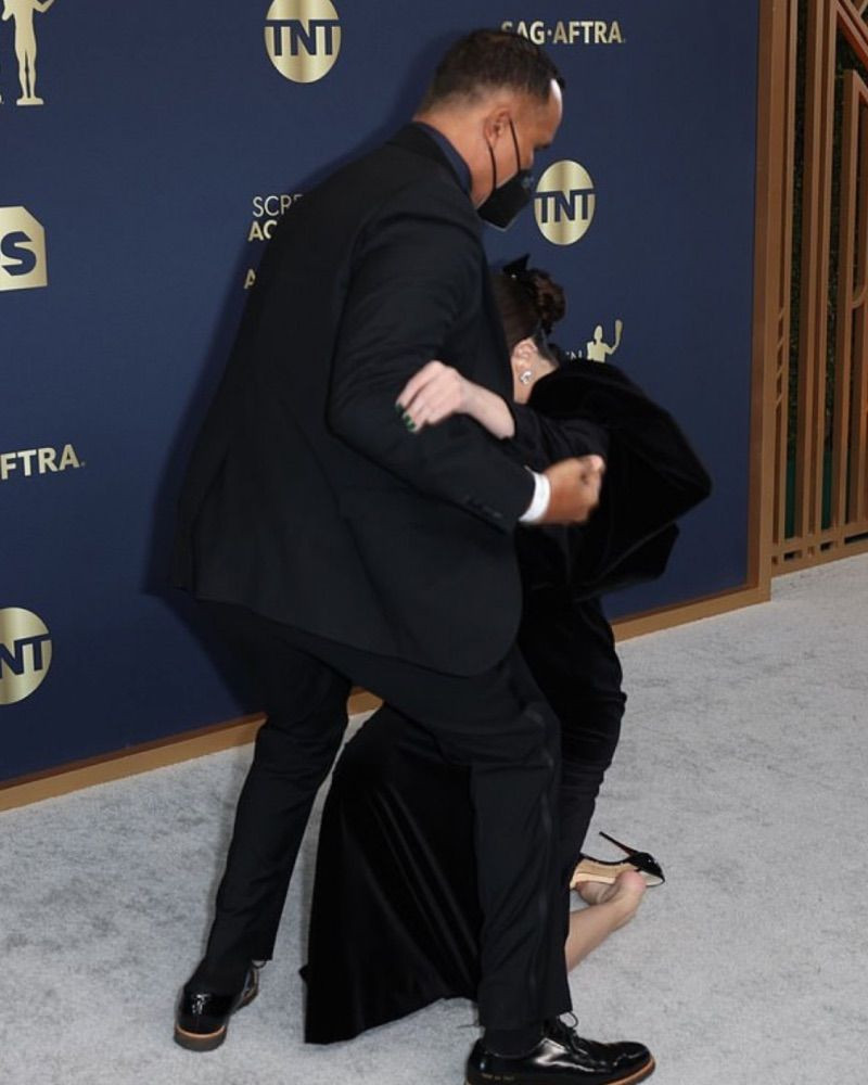 Kırmızı halıda yere düşen oyuncu sahneye topuklu ayakkabısı olmadan çıktı.