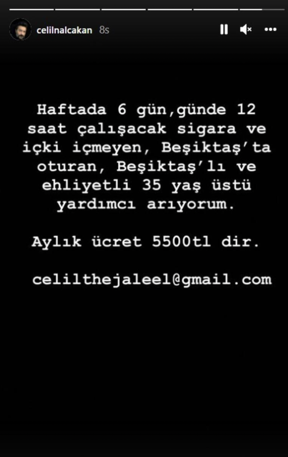 Nalçakan yaptığı paylaşımda, "Haftada 6 gün, günde 12 saat çalışacak sigara ve içki içmeyen, Beşiktaş'ta oturan, Beşiktaşlı ve ehliyetli 35 yaş üstü yardımcı arıyorum. Aylık ücret 5bin 500 TL'dir." diye yazdı.
