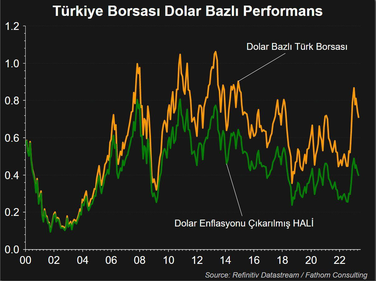 2) Yeşil çizgi, Türk Borsasının Dolar cinsinden seviyesinden Dolar enflasyonunun arındırılmış hali!