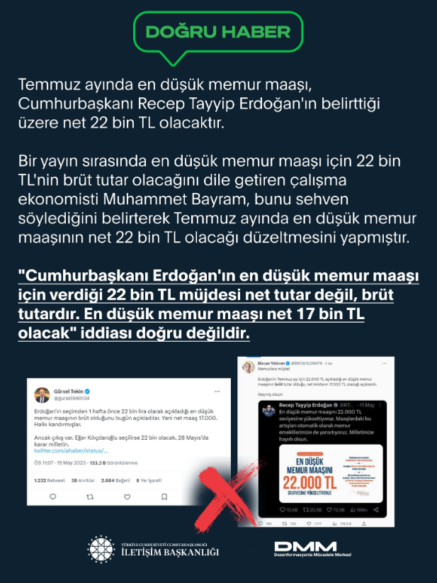 Cumhurbaşkanı Erdoğan'ın açıkladığı "En düşük memur maaşı Temmuz ayında 22 bin lira olacak" sözleri A Haber ekranında yorumlandı. A Haber canlı yayınında Erdoğan'ın açıkladığı 22 bin liranın brüt tutar olduğu, net miktarın ise 17 bin lira olacağı açıklandı. Konu ile ilgili açıklamaya İletişim Başkanlığı'ndan yanıt geldi. İletişim Başkanlığı Dezenformasyonla Mücadele Merkezi üzerinden söz konusu açıklamayı yalanladı.