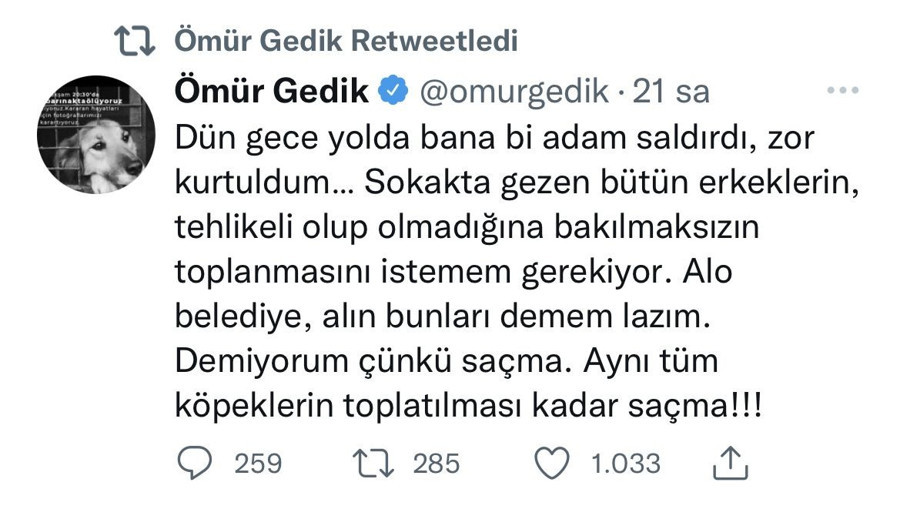Tweet defalarca geri paylaşım yapıldı. Ömür Gedik'e geçmiş olsun mesajları arka arkaya geldi. Ömür Gedik ise saldırıya uğramadığını sokak hayvanlarına dikkat çekmek için o tweeti attığını dile getirdi.
