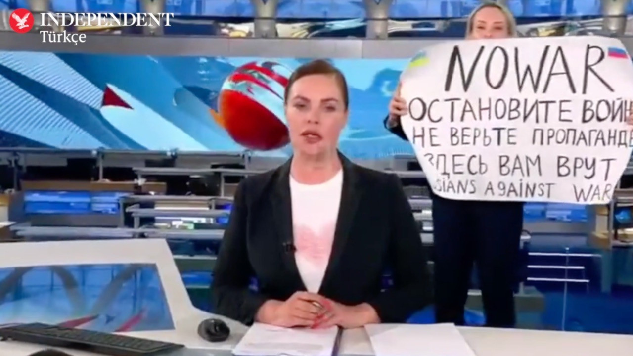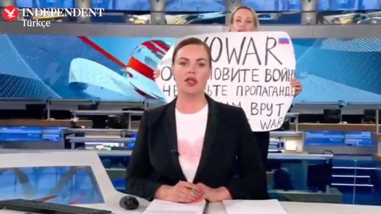 Rusya devlet televizyonu çalışanı Marina Ovsyannikova da haber yayını sırasında ‘Savaşa hayır. Savaşı durdurun. Propagandaya inanmayın. Burada size yalan söylüyorlar’ yazılı dövizle birlikte canlı yayına çıktı.