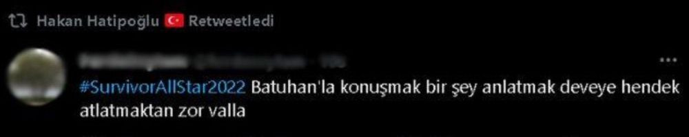 Bir Survivor izleyicisinin Batuhan hakkındaki sözlerini kendi profilinde alıntılayan Hakan Hatipoğlu olay oldu. Sosyal medya kullanıcısının, ‘Batuhan'la konuşmak bir şey anlatmak deveye hendek atlatmaktan zor valla’ sözlerini kendi profilinde alıntılayan Hatipoğlu, oldukça dikkat çekti.