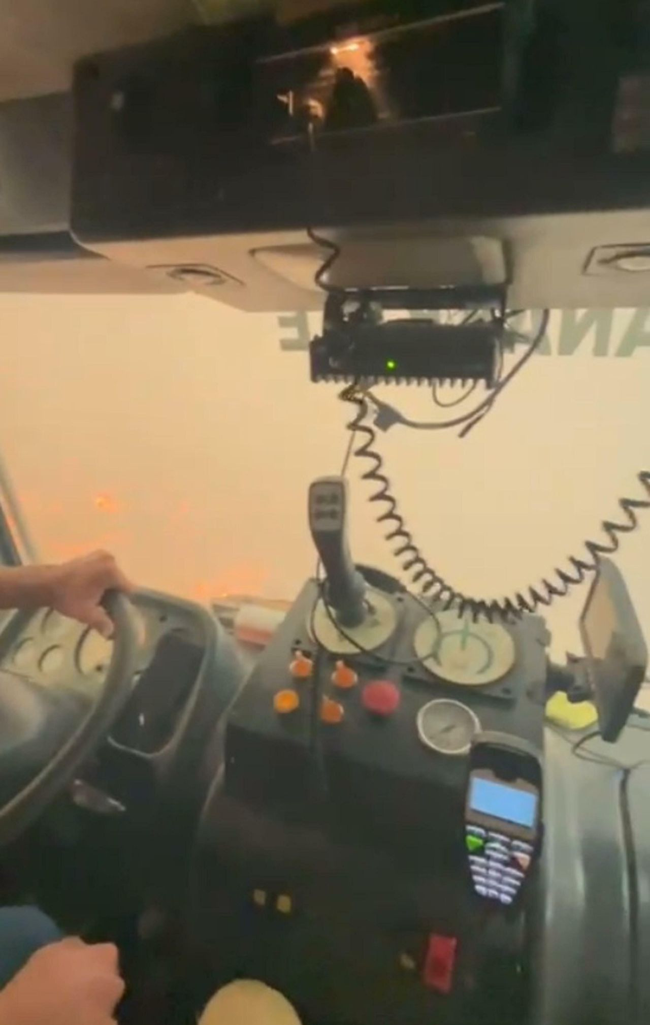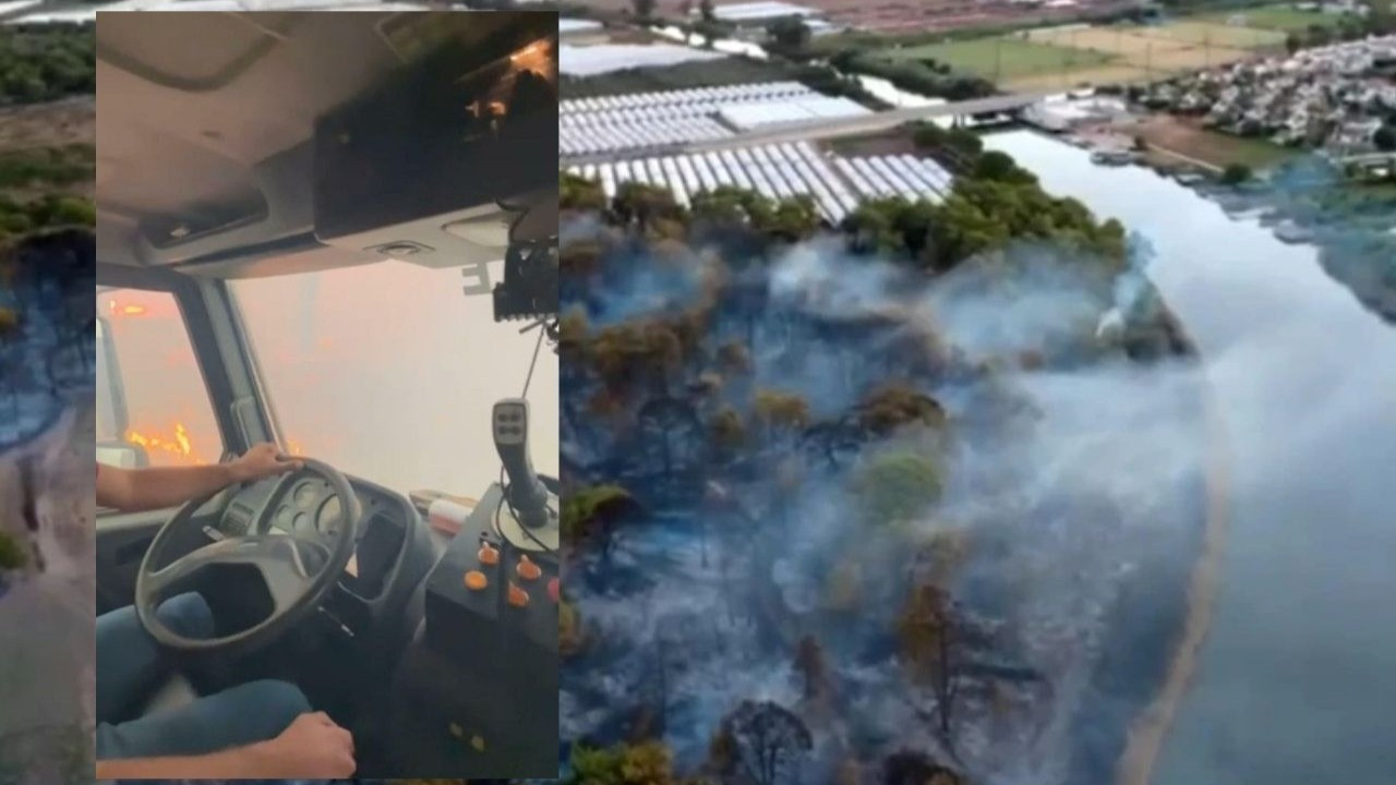 Ayvacık Orman İşletme Müdürlüğü Ezine Şefliği’ne bağlı A6 no’lu arazöz yangının ilk anlarında müdahale için gittiği bölgede alevlerin arasında kaldı. Arazöz alevlerden uzaklaşırken; orman işçileri o anları cep telefonu kamerasıyla kaydetti.