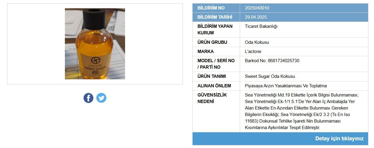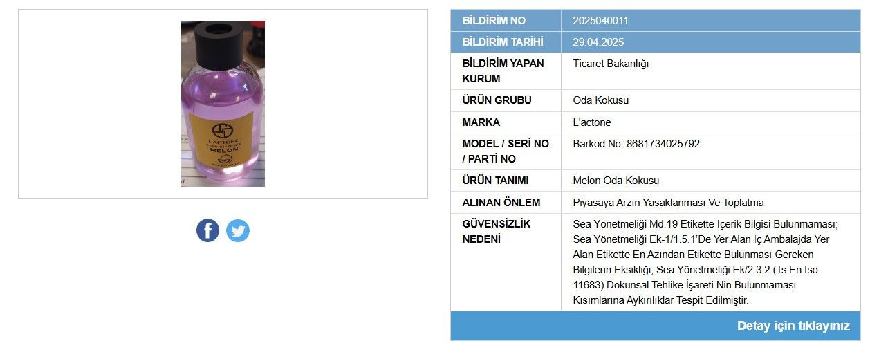 Yapılan denetimlerin ardından Bakanlık, iki adet oda kokusunun kullanımının sağlıksız olduğunu tespit etti. İlgili ürünler hakkında yasaklanması kararı alınırken, piyasadan toplatılmalarına karar verildi.