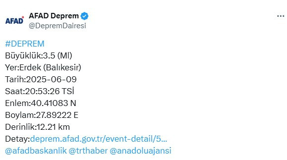 Afet ve Acil Durum Yönetimi Başkanlığı (AFAD) tarafından yapılan açıklamaya göre, yerin 12.21 kilometre derinliğinde gerçekleşen depremin merkez üssü Erdek olarak belirlendi.