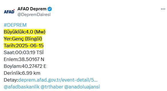 Afet ve Acil Durum Yönetimi Başkanlığı (AFAD), Bingöl’ün Genç ilçesinde 4.0 büyüklüğünde bir deprem meydana geldiğini duyurdu.