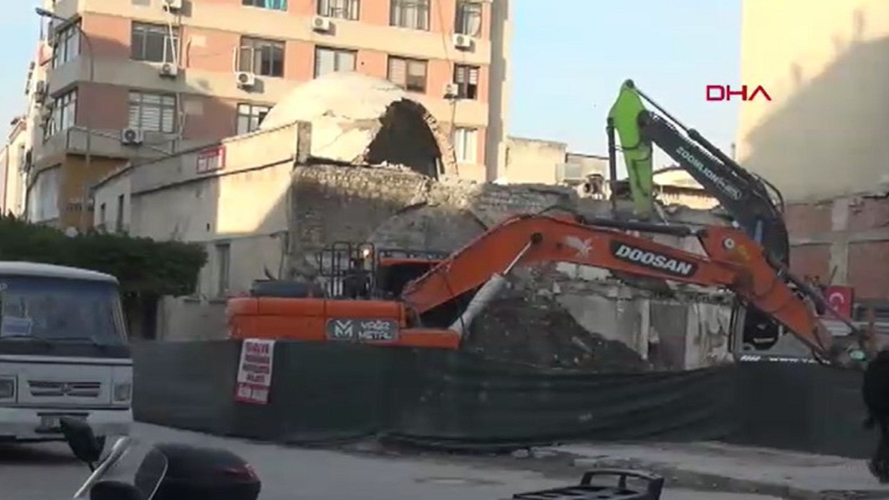 Hatay'ın İskenderun ilçesindeki tarihi hamamın kubbesi, depremde ağır hasar alan yanındaki binanın yıkımı sırasında hasar gördü.