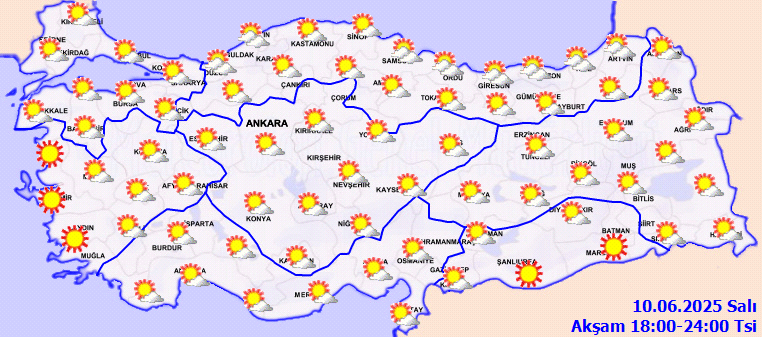 Meteoroloji Genel Müdürlüğü tarafından yapılan tahminlere göre: Ülkemizin doğu kesimlerinin parçalı, yer yer çok bulutlu, Edirne, Karabük, Ardahan, Kars, Ağrı, Iğdır ve Hakkari çevreleri ile Denizli’nin güney, Antalya’nın batısının iç kesimleri ve Van'ın doğu kesimlerinin yerel olmak üzere sağanak ve gök gürültülü sağanak yağışlı, diğer yerlerin az bulutlu ve açık geçeceği tahmin ediliyor.