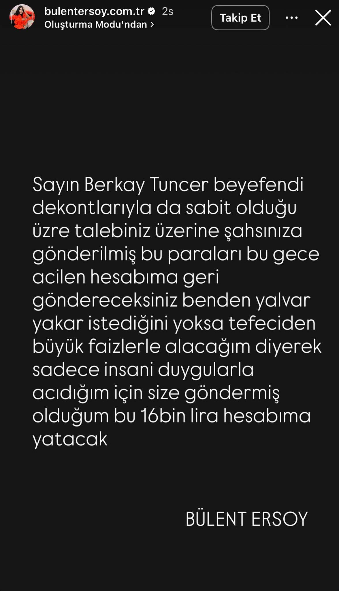 Türk Sanat Müziği'nin "Diva" lakaplı sanatçısı Bülent Ersoy, sosyal medya hesabından takipçilerini şaşırtan bir paylaşımda bulundu. Ersoy, paylaşımında bir kullanıcıya insani duygularla yardım amacıyla para gönderdiğini ancak parasını geri alamadığını belirterek verdiği borcun ödenmesini istedi. Diva, yaptığı son paylaşımla sosyal medyada borç verdiği bir kişiyi fena ifşa etti.