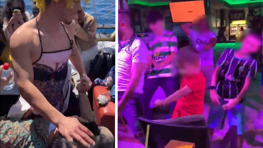 Marmaris'te mide bulandıran yeni görüntüler gelmeye devam ediyor. Turistleri gezdiren bir tekneden paylaşılan görüntülerde kadın vücudunun resmedildiği bir önlük giyen kişi erkek turistlere müstehcen hareketler yapıyor.