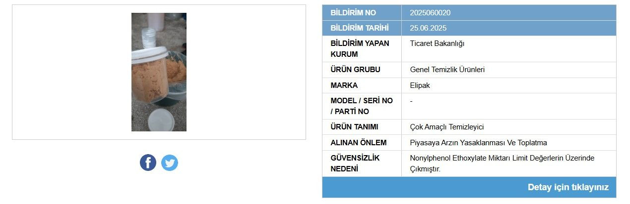 Ticaret Bakanlığı, 'Güvensiz Ürün Bilgi Sistemi' üzerinden sağlık riski barındıran ve usulsüzlük yapılan yeni ürünleri kamuoyuna açıklamaya devam ediyor. Piyasadaki riskli ürünlerle ilgili yayınlanan liste yapılan son denetimlerin ardından güncellendi. Sık sık çocuk ürünlerinin ifşa edildiği listede bu kez bir markanın temizlik ürünü yer aldı.