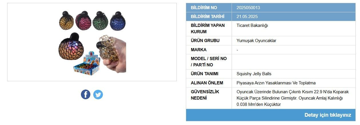 Ticaret Bakanlığı, Güvensiz Ürün Bilgi Sistemi üzerinden sağlık riski barındıran yeni ürünleri kamuoyuna açıklamaya devam ediyor. Piyasa gözetimi ve denetimi kapsamında yürütülen çalışmalar sonucu bir oyuncağın sağlık açısından risk taşıdığı tespit edildi. Ürünün hem raflardan kaldırılması hem de satışının tamamen durdurulması kararlaştırıldı.