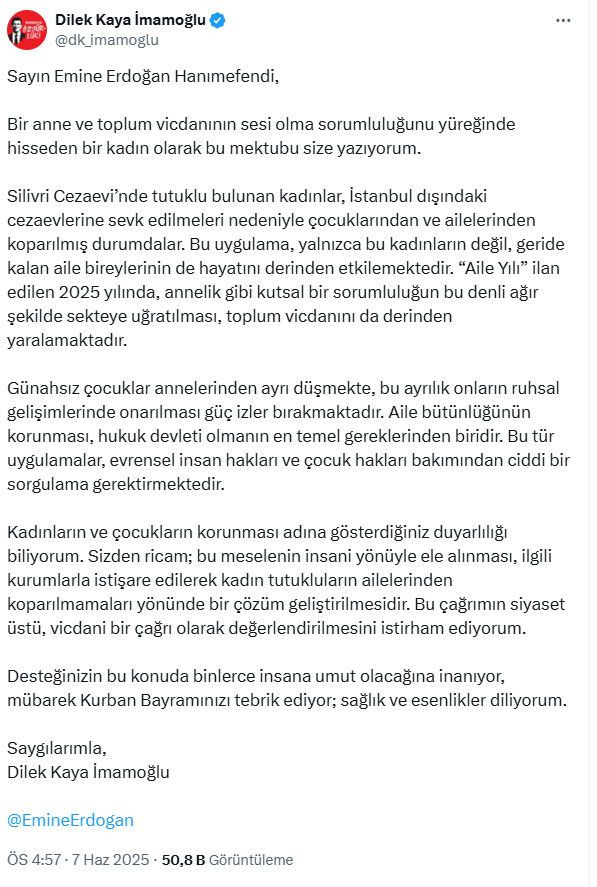 Dilek Kaya İmamoğlu, cezaevindeki annelerin çocuklarıyla ilişkileri üzerinden yaşanan mağduriyetlerle ilgili Emine Erdoğan'a bir çağrıda bulundu.