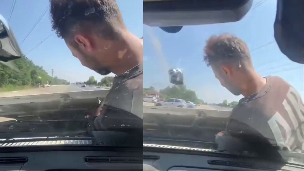 Sürücü, aracından gelen sesi dinlemesi için ustayı motorun içine bindirdi. Kaputu açık şekilde ilerleyen otomobil, bir süre ters şeritte gitti. Trafiği tehlikeye düşüren yolculuk cep telefonu kamerasıyla kaydedildi.