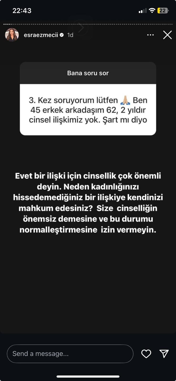 Ezmeci “Ben 45, erkek arkadaşım 62, 2 yıldır cinsel ilişkimiz yok. Şart mı diyor” sorusuna da "Evet bir ilişki için cinsellik çok önemli deyin. Neden kadınlığınızı hissedemediğiniz bir ilişkiye kendinizi mahkum edesiniz? Size cinselliğin önemsiz demesine ve bu durumu normalleştirmesine izin vermeyin.” sözleriyle yanıt verdi.