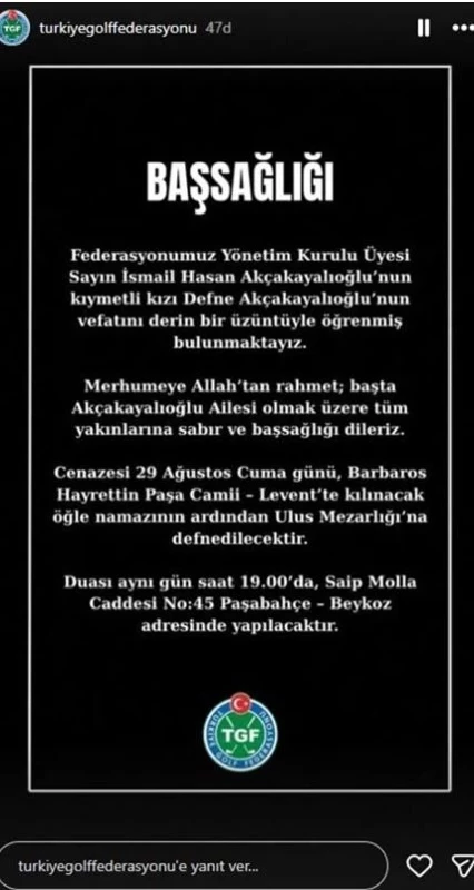 Türkiye Golf Federasyonu tarafından yapılan açıklamada; "Federasyonumuz Yönetim Kurulu Üyesi Sayın İsmail Hasan Akçakayalıoğlu’nun kıymetli kızı Defne Akçakayalıoğlu’nun vefatını derin bir üzüntüyle öğrenmiş bulunmaktayız.