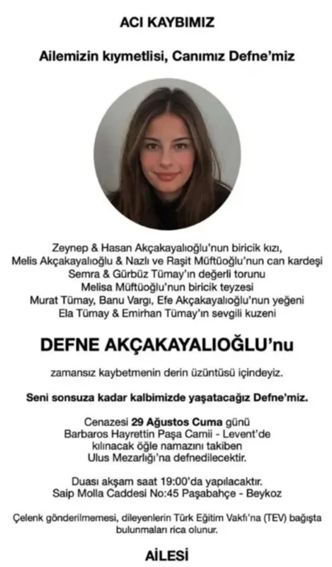 Türk iş dünyasının tanınmış isimlerinden Hasan Akçakayalıoğlu ile eşi Zeynep Akçakayalıoğlu’nun kızları Defne Akçakayalıoğlu, genç yaşında hayatını kaybetti.
