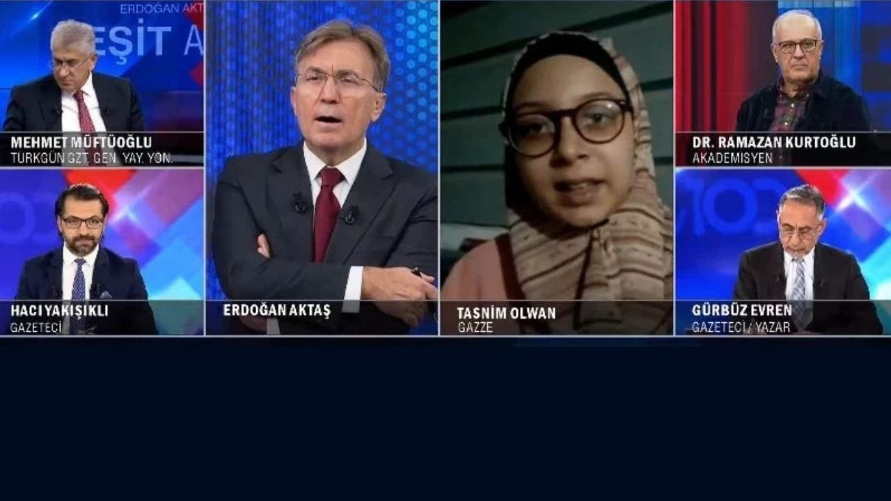 Ateşkes ile birlikte İsrail’in ablukası zayıfladı ve Gazze’de bomba sesleri azaldı. tv100’de yayımlanan Erdoğan Aktaş ile Eşit Ağırlık programına Türkiye’de eğitim aldıktan sonra Gazze’ye dönen küçük kız Tasnim Olwan canlı yayına görüntülü bağlandı.