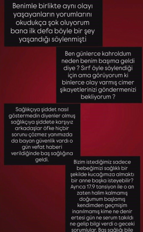 Sevk edildiği hastanede karşılaştığı tavırları da anlatan T.Z. "Oraya gittiğimde ise 'Neden geldin' gibi tavırlarla karşılaştım. Zaten yolda aramıştım orayı. Aradığımda da çok sert konuşmuşlardı. 'Başka yere git, yerimiz yok' dendi. Telefon kayıtlarında da mevcut bu. Çok sert bir şekilde muayenem yapıldı. Azarlamalara maruz kaldım. Ses çıkaramadım. Bir şey diyemedim çünkü çok kötü bir durumdaydım. Gebelikte tansiyonum çıktığı için o gece tansiyonum oldukça yüksekti, 17-18 civarındaydı. Pekiyi bir durumda değildim zaten. Daha sonra bankoya geçtiğimizde kaydım yapılırken kadın doğum servisinde normal bir odaya alınacaktım. Doğumhaneye değil, normal bir servise alınacaktım. Odaya alınırken sancılarım tuttu. Bana karın ağrısı dediler. Zaten açılmam vardı ama normal bir servis odasına alındım. NST'ye bağlanmadım. Sadece bir serum takıldı, bir ilaç takıldı. Bir ara kendimden geçtim. 'Sancıların geçecek, bekleyeceksin' dediler. Benim 2 dakikada bir sancılarım geliyordu. Çok kuvvetli bir şekilde bağırıyordum. 'Karın ağrısı, normal, bu doğum sancısı değil' dediler" ifadelerini kullandı.