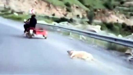 Kentte kaydedilen görüntülerde 2 kişi, kullandıkları sepetli motosikletin arkasına bağladıkları köpekle yolda ilerledi. Köpeğin hareketsiz halde sürüklendiği anlar, arkadan gelen otomobildeki kişi tarafından cep telefonuyla kayda alındı.