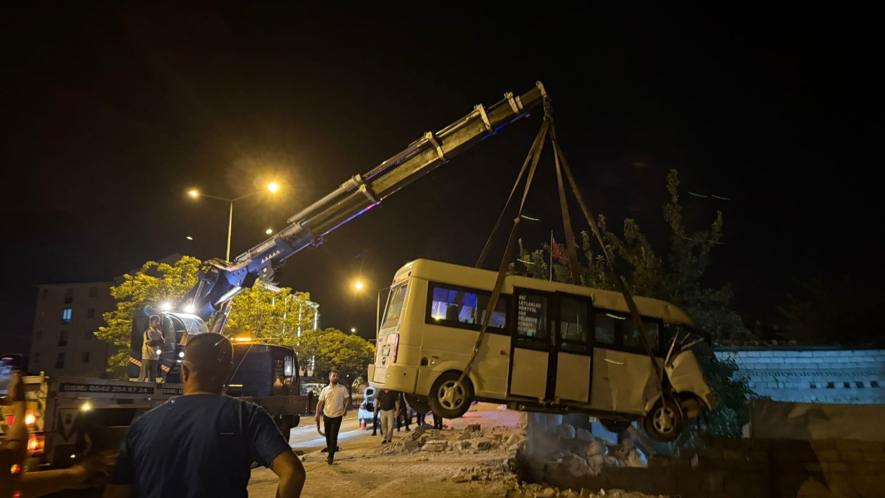 Sürücüsünün ismi henüz öğrenilemeyen 76 ABF 552 plakalı yolcu minibüsü, yoldan çıkarak bir evin bahçe duvarına çarptı. Çarpmanın etkisiyle minibüs, duvarda askıda kaldı.