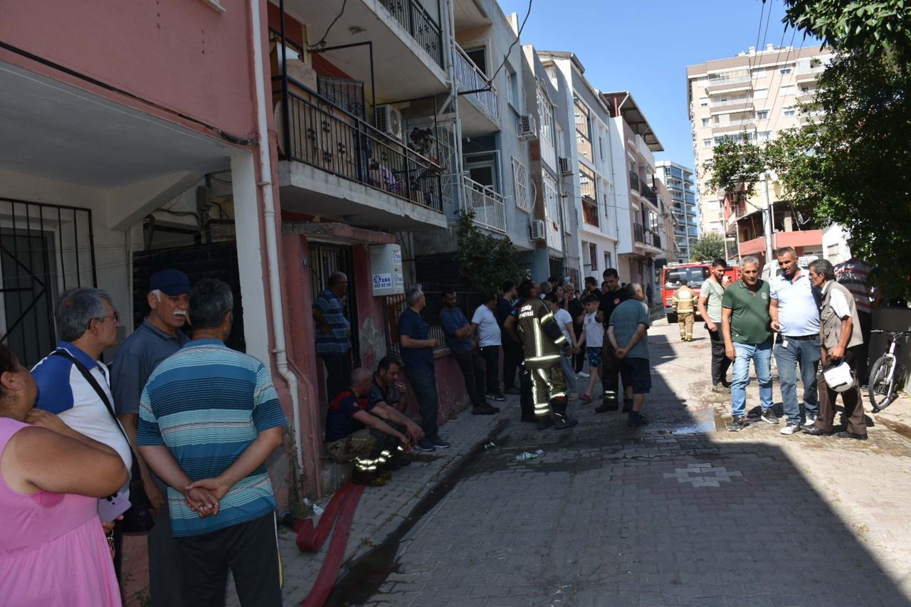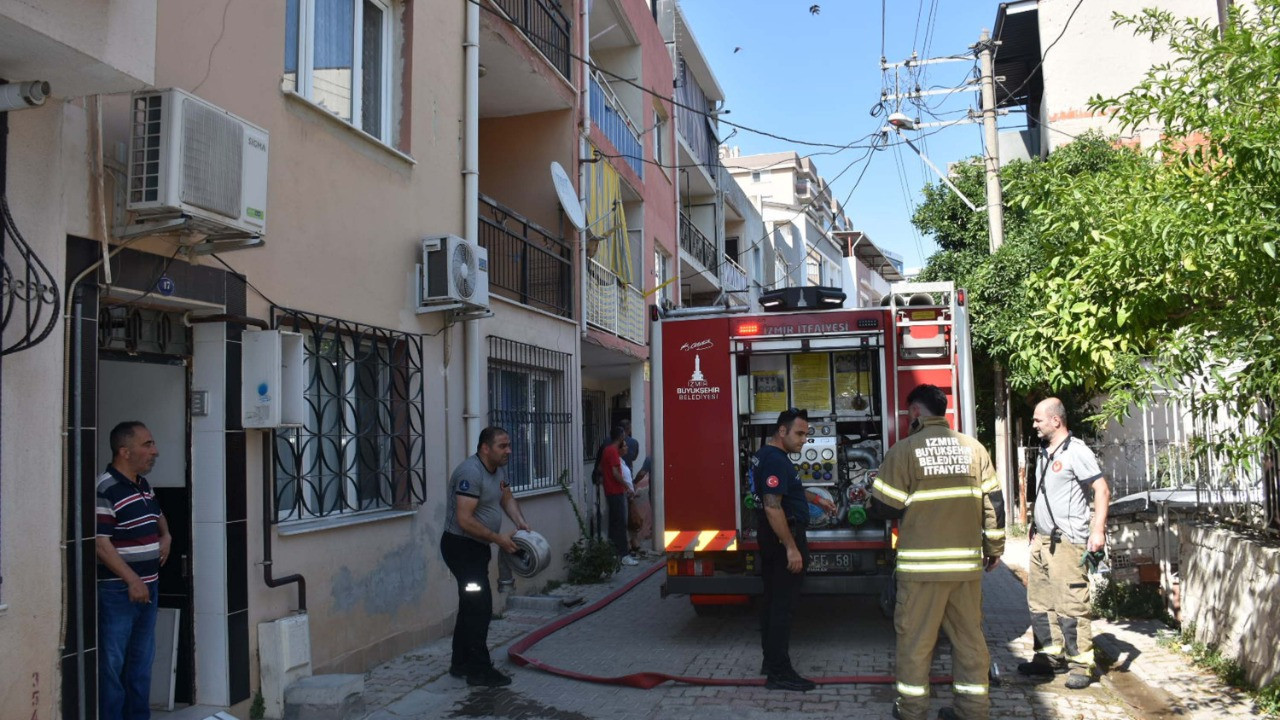 İzmir'deki yangın, saat 16.30 sıralarında Bayraklı ilçesi Adalet Mahallesi 1645/7 Sokak'ta bulunan 3 katlı bir apartmanın zemin katındaki dairede çıktı. Henüz belirlenemeyen nedenle çıkan yangın kısa sürede büyürken, dumanlar binanın üst katlarına kadar yükseldi.