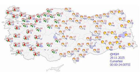 Meteoroloji Genel Müdürlüğü, 29 Kasım Cumartesi günü hava durumu raporunu yayınladı. Yapılan tahminlere göre: Yurdun batı kesimlerinin parçalı ve çok bulutlu, Marmara, Ege, Akdeniz, İç Anadolu (Sivas hariç) ile Batı Karadeniz bölgelerinin sağanak ve gök gürültülü sağanak yağışlı, diğer yerlerin az bulutlu geçeceği tahmin ediliyor.