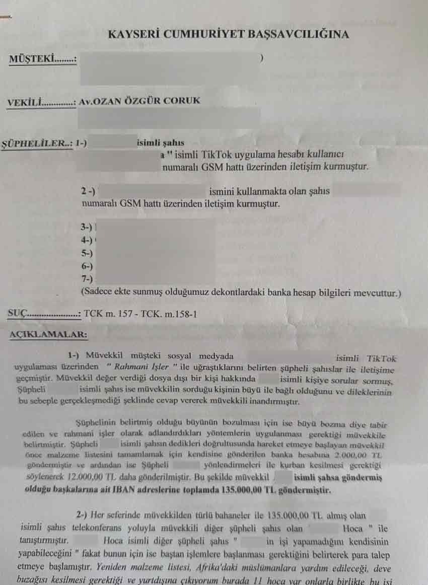 Kayseri’de yaşayan N.K.; aşık olduğu kişi ile bir araya gelebilmek için çözüm yolu ararken, sosyal medya platformu üzerinden bir hesapla karşılaştı. Hesap sahibinin kendilerini bir araya getirebileceğini söylemesi üzerine iletişime geçen N.K., daha sonra kendisinden istenilenleri yapmaya başladı. Hesap sahibinin kendisinden malzeme adı altında istediği 135 bin TL’yi 9 parça halinde farklı hesaplara gönderdikten sonra çözüm bulamayınca başka bir kişiye yönlendirildi.