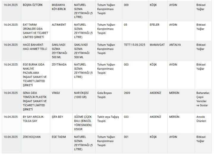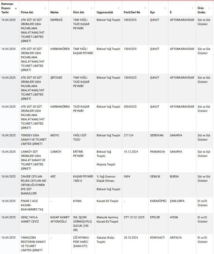 Bakanlığın 16 Nisan’da güncellediği taklit ve tağşiş listesinde peynirlerde yapılan usulsüzlüklere yer verildi. Buna göre kaşar peynirden alınan örneklerde bitkisel yağ tespit edildi. Eritme peynirde de yine bitkisel yağ bulunurken ayrıca nişasta da görüldü.