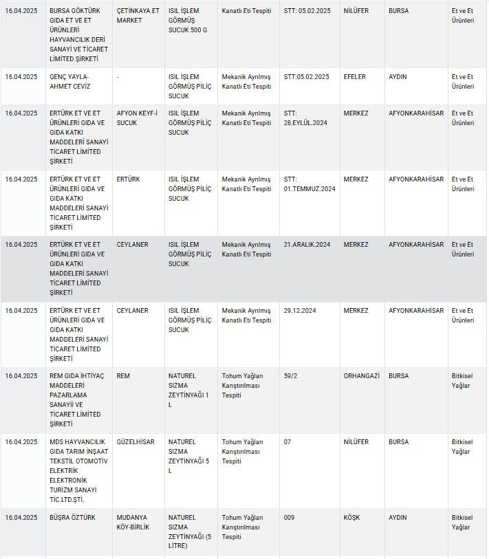 Kıyma, pide harcı ve piliç sucukta yapılan denetimler yine pes dedirtti. Şanlıurfa’da hizmet veren bir kasabın kıymasında kanatlı et tespit edilirken Aydın’da ısıl işlem görmüş piliç sucuktan alınan örnekte mekanik ayrılmış kanatlı et tespit edildi. Antalya’da bir restoranın kıymalı pide harcında da sakatat (kalp) bulundu.