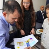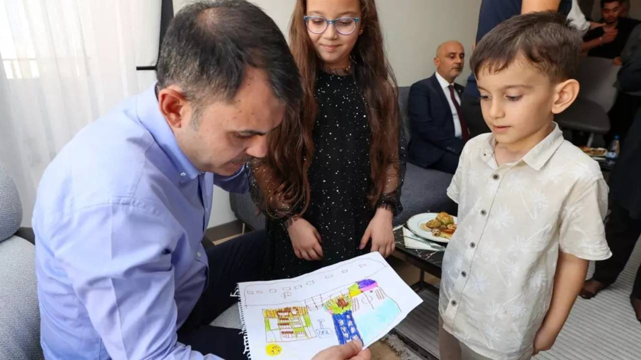 İki kardeş, TOKİ'nin yaptığı evlerini ve Bakan Kurum'un evini yan yana hayal ederek çizdikleri resmi kendisine hediye etti.