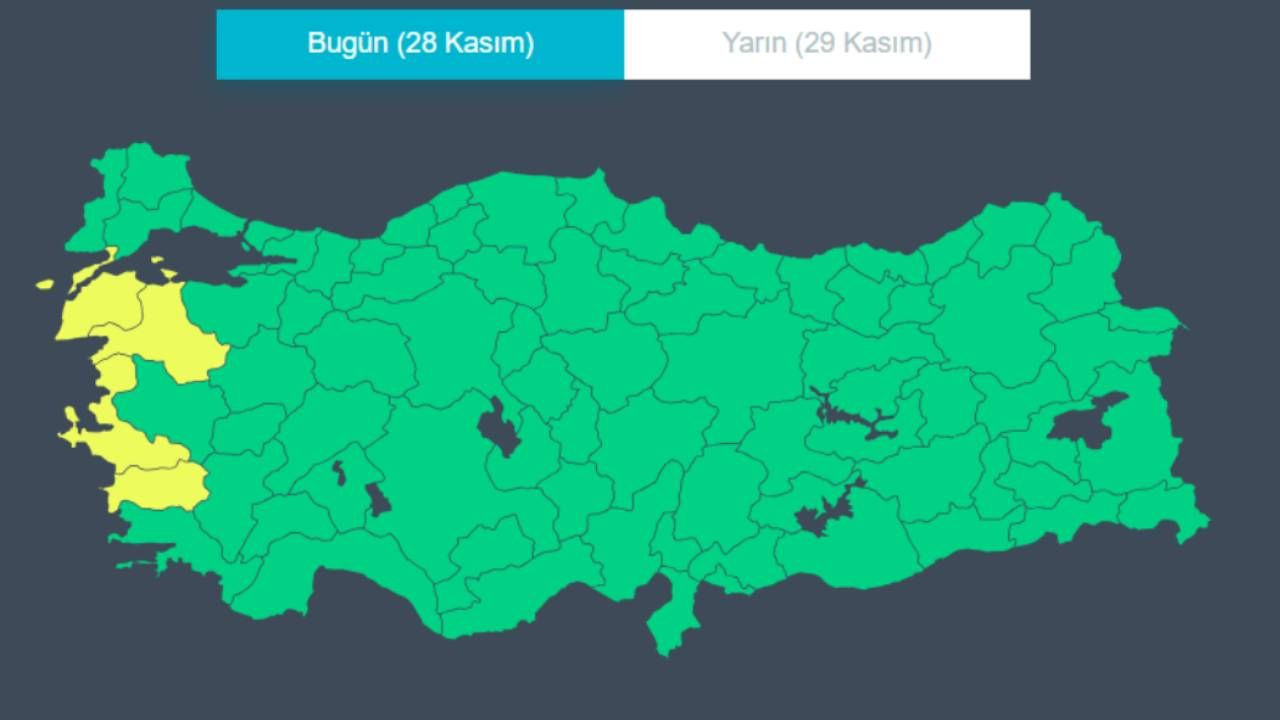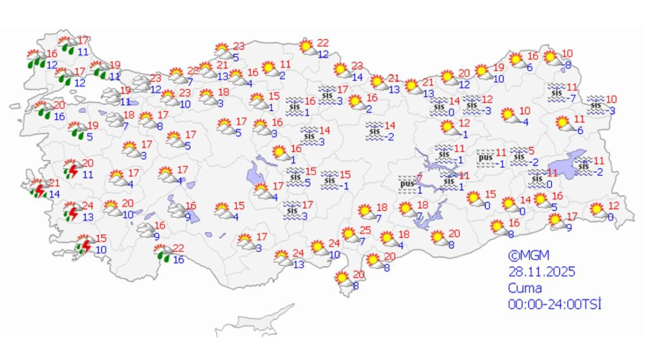 Meteoroloji Genel Müdürlüğü, 28 Kasım 2025 Cuma günü hava durumu raporunu yayınladı. Yapılan tahminlere göre ülkemiz genelinin parçalı, yer yer çok bulutlu, Marmara’nın batısı ve Kıyı Ege ile Bursa ve Manisa çevrelerinin sağanak ve yer yer gök gürültülü sağanak yağışlı geçeceği tahmin ediliyor.
