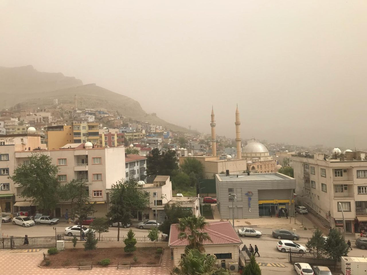Mardin’in Derik ilçesinde de toz taşınımı, hayatı olumsuz etkiledi. Gökyüzü turuncu renge bürünürken, vatandaşlar maskeyle sokağa çıktı.