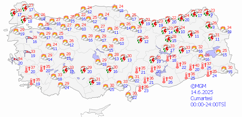 Meteoroloji Genel Müdürlüğü, 14 Haziran için hava tahmin raporunu yayımladı. 3 bölgede sağanak yağış bekleniyor. Doğu Karadeniz ve Doğu Anadolu’nun bazı kesimlerinde yağışların yerel olarak kuvvetli olacağı açıklandı. Termometrelerin 40 dereceyi göstereceği Güneydoğu Anadolu’da ise toz taşınımı nedeniyle görüş mesafesi düşebilir.