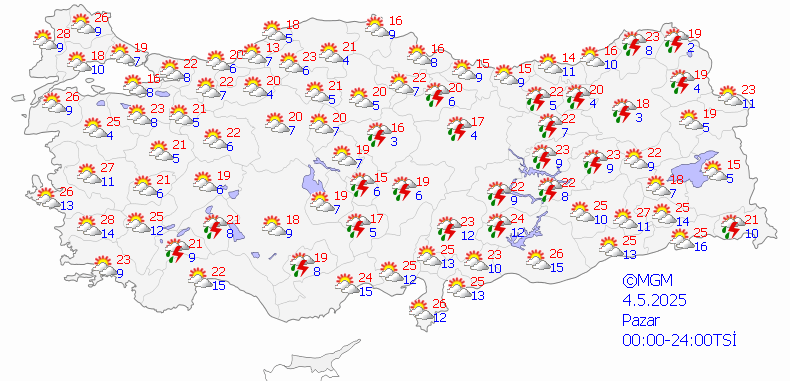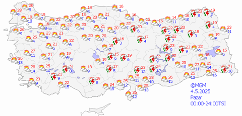 Meteoroloji Genel Müdürlüğü'nün yaptığı açıklamaya göre, Türkiye genelinde hava durumu parçalı ve çok bulutlu olacak. Akdeniz, İç Anadolu'nun güney ve doğusu, Orta Karadeniz ile Muğla, Denizli, Afyonkarahisar, Giresun, Trabzon ve Hakkari çevrelerinde sağanak ve gök gürültülü sağanak yağış bekleniyor.