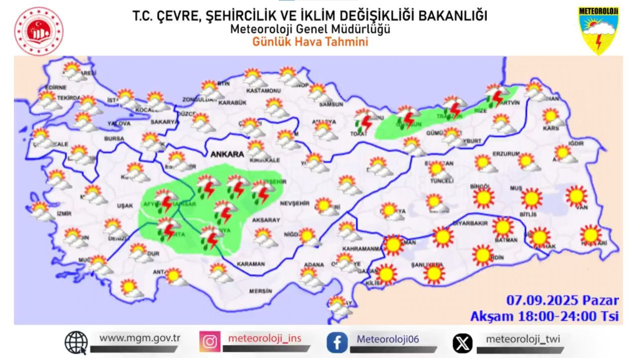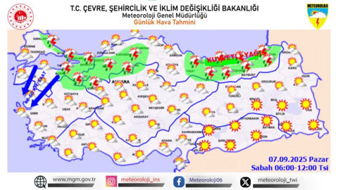 MGM, 7 Eylül Pazar günü (bugün) için yeni hava durumu raporunu yayımladı. Yurt genelinin parçalı bulutlu olması beklenirken, hava sıcaklığında İç Anadolu Bölgesi haricinde değişiklik olması beklenmiyor. Birkaç gündür yurdun bir bölümünde süren gök gürültülü ve sağanak yağışların bir süre daha devam edeceği öngörülüyor. Bugün hava nasıl olacak? İşte il il ve 7 Eylül Pazar hava durumu raporu..
