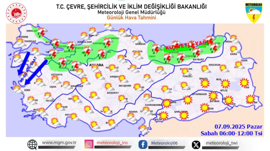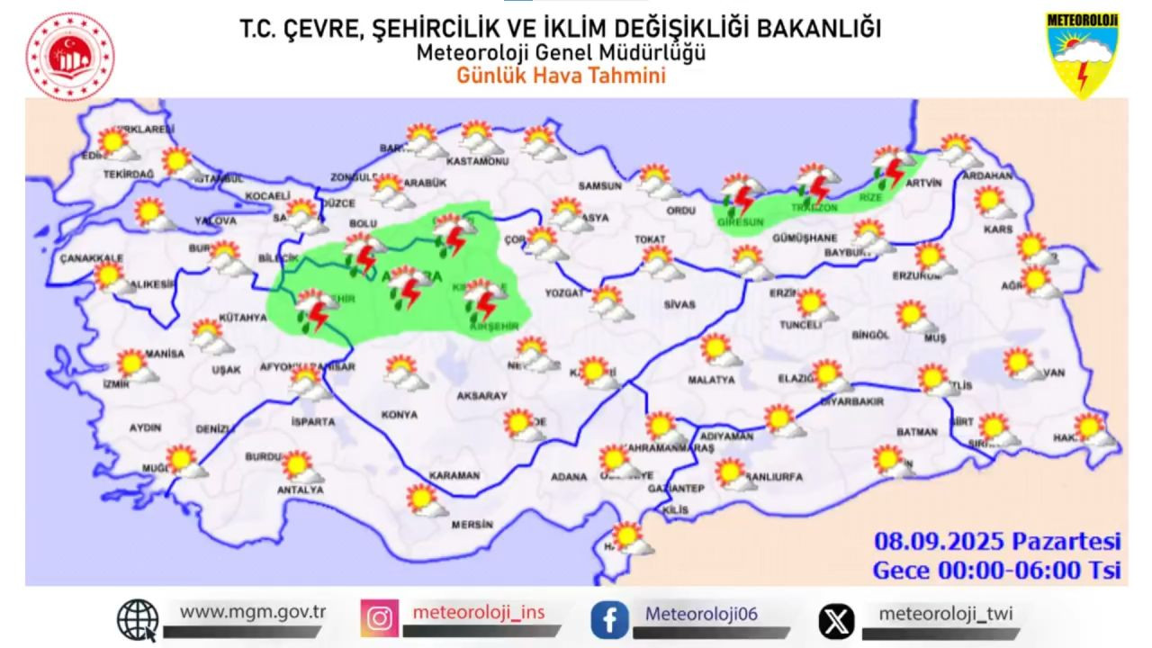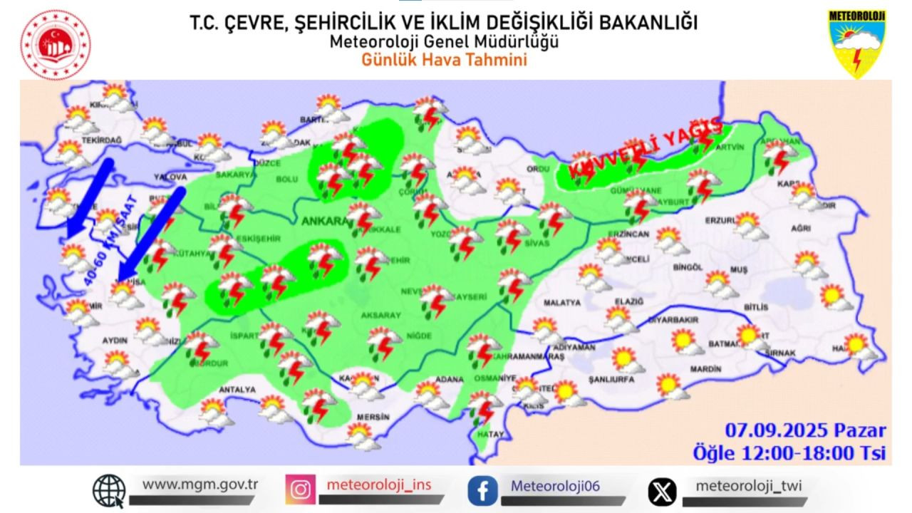 Yağışların; Doğu Karadeniz kıyıları ile Afyonkarahisar, Karabük Çankırı, Kastamonu çevreleri ve Ankara'nın güney ilçelerinde yerel kuvvetli olması bekleniyor. Rüzgar, Marmara’nın güneyi ve Kuzey Ege kıyılarında kuzeyli yönlerden kuvvetli olması bekleniyor.