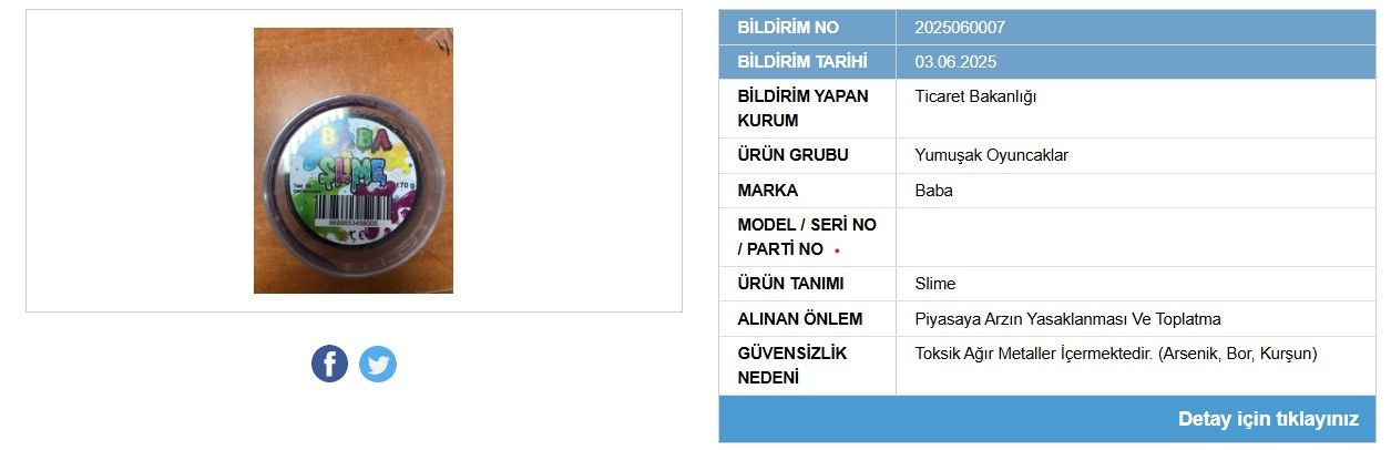 Güvensiz Ürün Bilgi Sistemi (GÜBİS) üzerinden açıklanan son verilere göre, sağlığı tehlikeye düşürdüğü belirtilen tüm ürünler hem yasaklandı hem de piyasadan geri çekilecek. Bakanlık tarafından bu zamana kadar yapılan denetimlerde özellikle çocuklara yönelik ürünlerde ciddi sağlık riskleri tespit edildiği bildirildi.