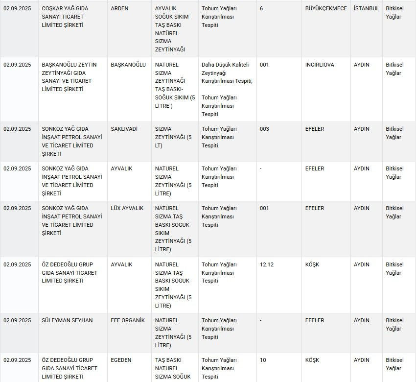 Ticaret Bakanlığı tarafından yayınlanan taklit ve tağşiş yapılan ürünler listesine göre bazı firmaların ürettiği zeytinyağlarında tohum yağı, et ürünlerinde kanatlı et ve sakatat tespit edildi. Gıda boyası tespit edilen çaylar, domates tespit edilen baharatlar ve taklit ve tağşiş yapıldığı ortaya çıkan ballar da listede ifşa edildi.