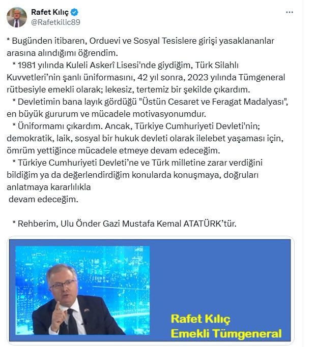 1981 yılında Kuleli Askerî Lisesi'nde giydiğim, Türk Silahlı Kuvvetleri’nin şanlı üniformasını, 42 yıl sonra, 2023 yılında Tümgeneral rütbesiyle emekli olarak; lekesiz, tertemiz bir şekilde çıkardım.